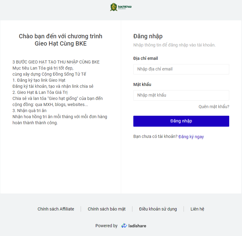 **Bước 1:** Đăng ký tài khoản gieo hạt tại website <https://share.bke.edu.vn/> nhấn vào đăng ký ngay ở phía dưới nút đăng nhập